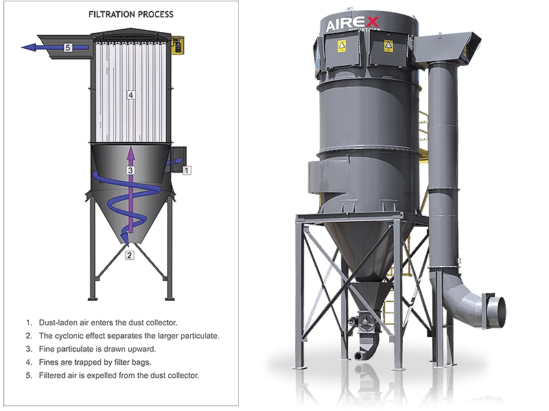 The lighter dust is drawn upwards for subsequent (secondary) filtration. At this step of the process, fine particulate is trapped within the cloth mesh of filter bags.