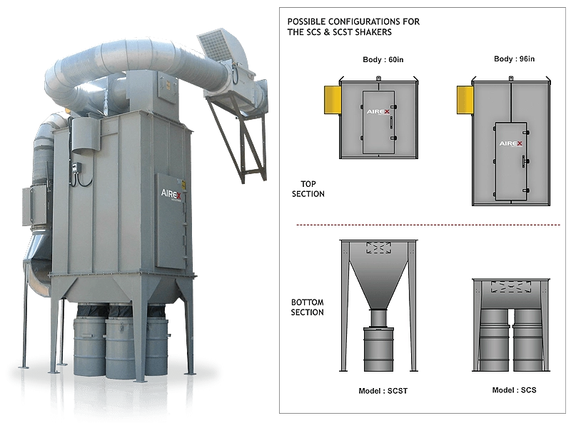 The filtered air meanders on to the shaker dust collector exit to be recirculated within the building or exhausted outside.