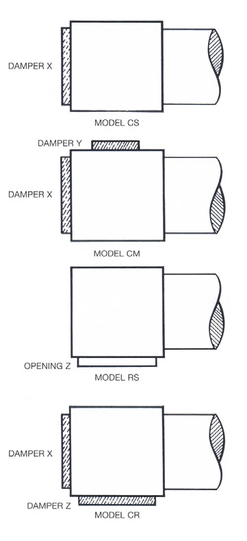 The CM unit is similar to the CS, except for a mixing damper (damper Y) on top of the casing. This second damper, controlled by a thermostat placed in the ducting, pre-mixes the air in the housing during cold weather. As in the CS model, the unit is supplied with an “on-off” switch.