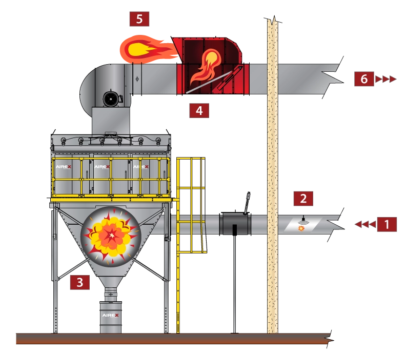 In accordance with standards NFPA 654, 652, 664, and 72, the ADX® abort damper quickly diverts the air outside the building in the event that a spark is detected.