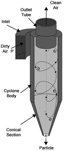 As the dirty air enters the cyclone dust collector, it is forced into a swirling movement. This results in a centrifugal force acting on the dust particles suspended in the air stream. The particles, denser than the air, are forced to move outwards, towards the cyclone dust collector wall. They then fall downwards, towards the dust exit. The clean air is eventually directed towards the centre of the cyclone and leaves through the gas exit.